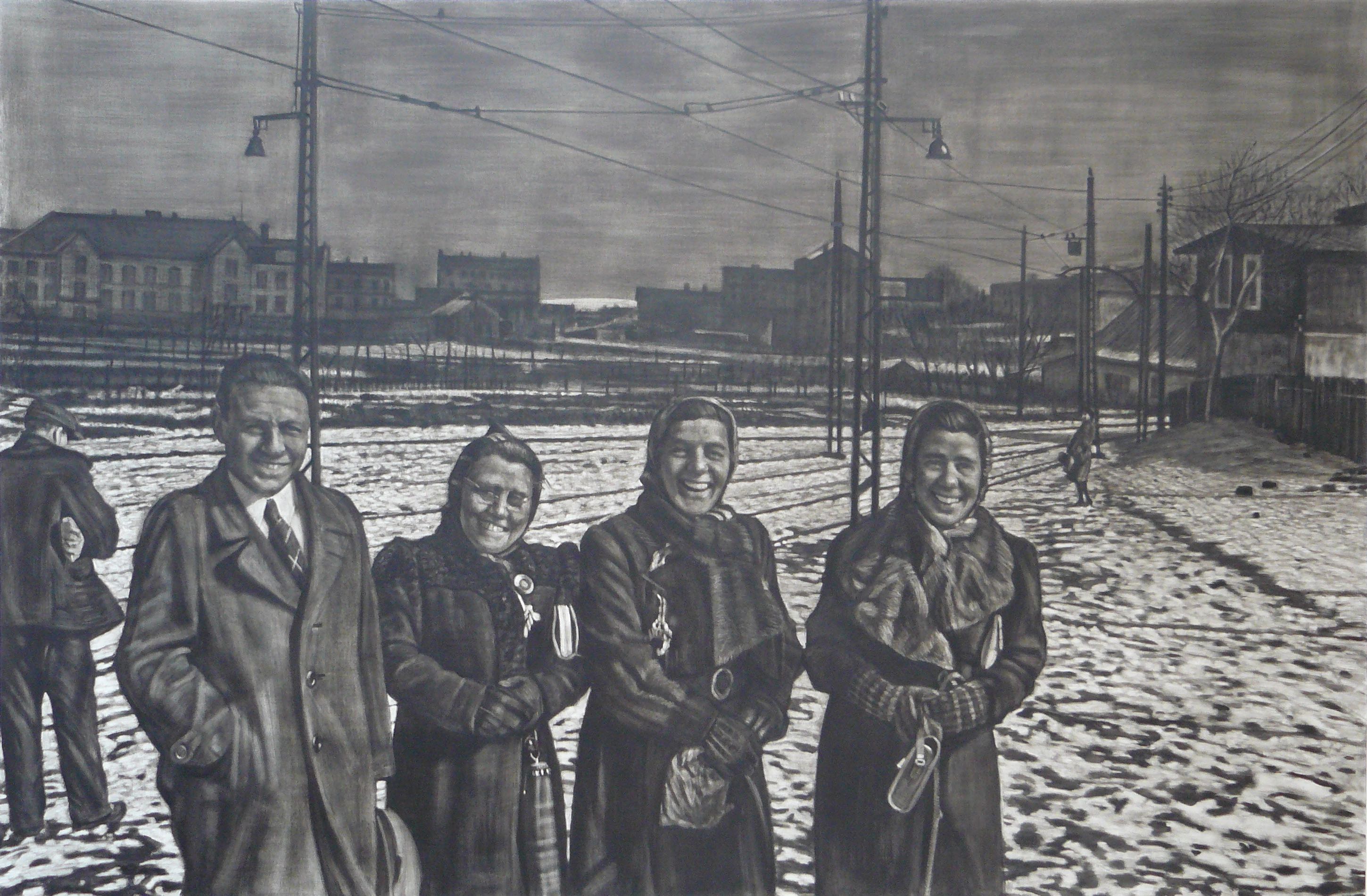 ‘Abordnung’ features paintings from a series entitled ‘Poland 1940-1941’. The paintings are based on snapshots in an album discovered in a Frankfurt flea market in 2013. They appear to show a group of civilian administrators in Sosnowiec in Poland during the Second World War.