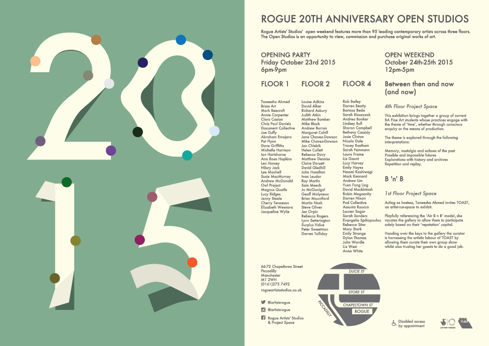 Everyone is welcome to Rogue Artists’ Studios’ 20th anniversary open weekend. The party is on Friday October 23rd, 6-9pm. The studios are open from 12-5pm Saturday 24th and Sunday 25th. We are just behind Piccadilly Railway Station in Manchester, UK.