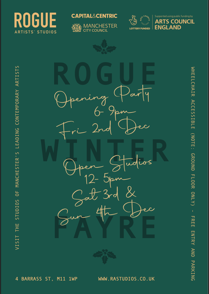 The ‘Rogue Winter Fayre’ is an opportunity to visit the work spaces of more than 85 leading contemporary artists. Rogue artists work across media including drawing, painting, printmaking, sculpture, collage, glass, textiles, film, photography, sound art, performance and assemblage, and will be on hand over the weekend to welcome visitors to our magnificent Grade 2 listed buildings. In addition to the Open Studios, Rogue’s brand new Project Space, acclaimed by Time Out Manchester as one of the best art galleries in the city, will host an exhibition of work by studio artists. All are welcome to the opening night party on Friday 2 December from 6-9pm.