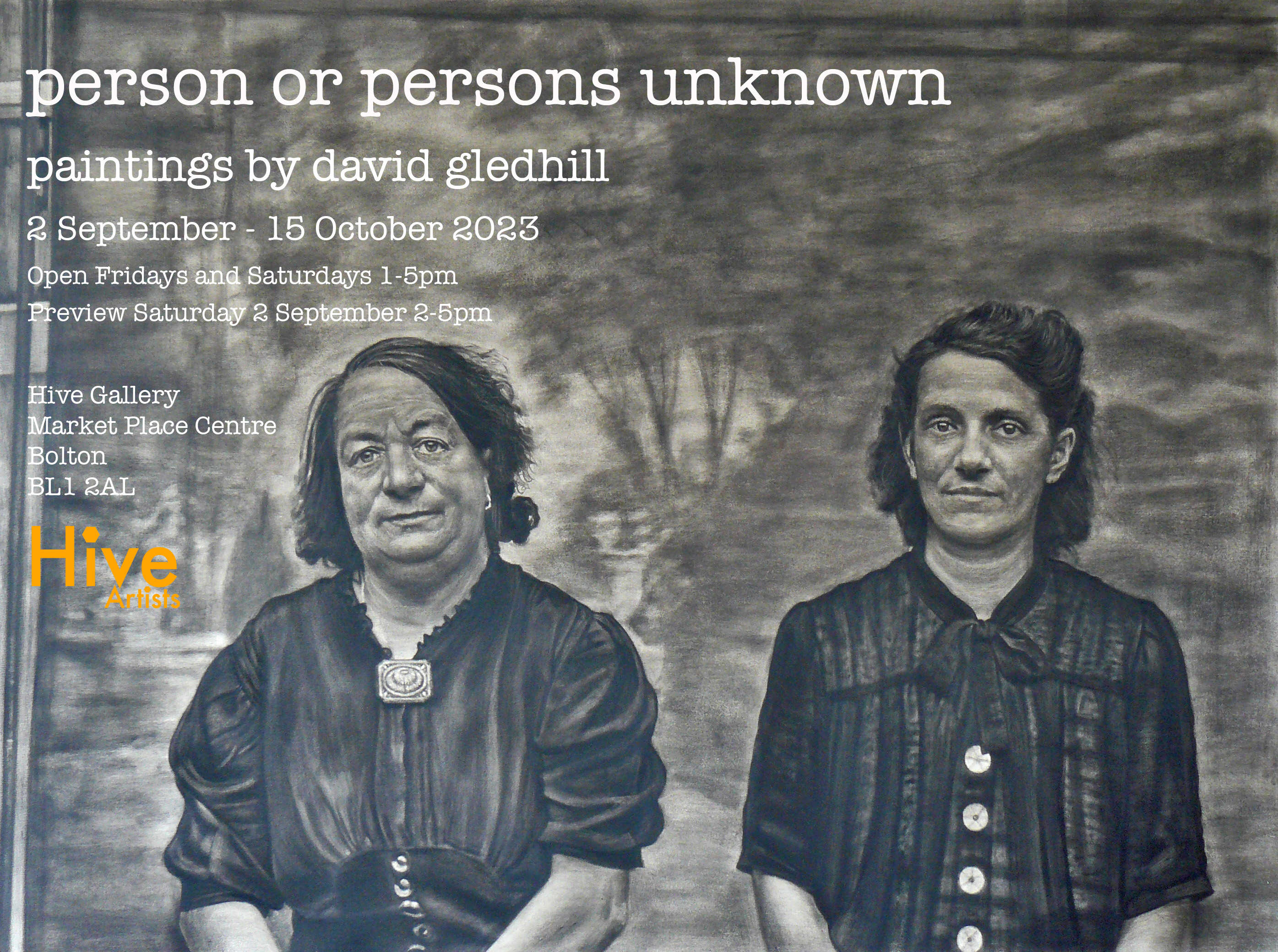 Person or Persons Unknown is the title of an exhibition held at the Hive Gallery, Bolton from September 2 – October 14, 2023. The exhibition consisted of paintings, films and assemblages produced since 2013 and based on found amateur snapshots sourced from flea markets both in the UK and abroad. The paintings depict ordinary citizens living through extraordinary times in Europe during the mid-twentieth century. The original photographs range from spontaneous snaps and photo booth sequences to official ID portraits and formal studio shots. The following essay about the exhibition was written by Phil Porter.