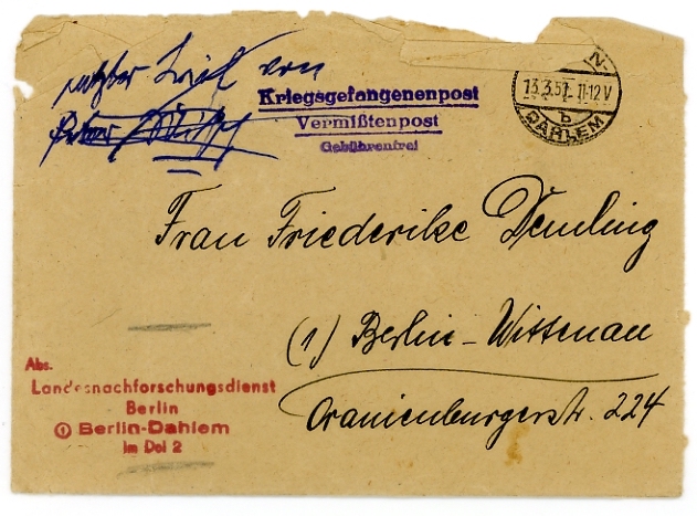 Kurt Demling was a primary school teacher. He was born on February 7th 1897 in Patzetz in Germany and worked in Berlin until August 1944 when he was seconded to a school in Breslau (Wroclaw in western Poland today). In November 1944 this posting was revoked when, aged 47, he was conscripted into the Wehrmacht. He went missing in action in February 1945. Kurt Demling’s papers were obtained from a fleamarket in Berlin in 2024. His last letter to his wife Frieda reads as follows: